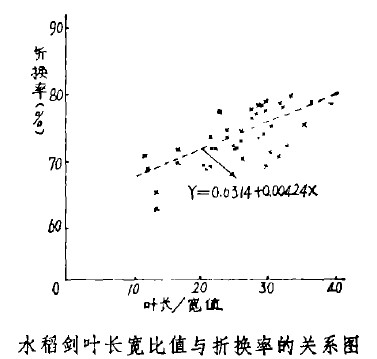 測(cè)定,證明是極顯著的,即折換值與葉長寬比的回歸關(guān)系可以成立(見圖)。