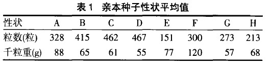 分年度調(diào)查每份材料的單瓜平均種子數(shù)及千粒重,再取兩年平均值,得到8個(gè)親本的單瓜平均種子粒數(shù)及千粒重。由表1可以看出,8個(gè)親本材料的單瓜種子粒數(shù)和千粒重差異較大。單瓜種子粒數(shù)在151467粒之間,其中E、G、H單瓜種子數(shù)較少,少籽性狀明顯;而材料A、B、C、D、F單瓜種子粒數(shù)較多,呈現(xiàn)多籽性狀。種子千粒重在5512攤之間,A、E、F千粒重大,為大型種子;B、D、C、G、H種子千粒重較小,屬中型種子。