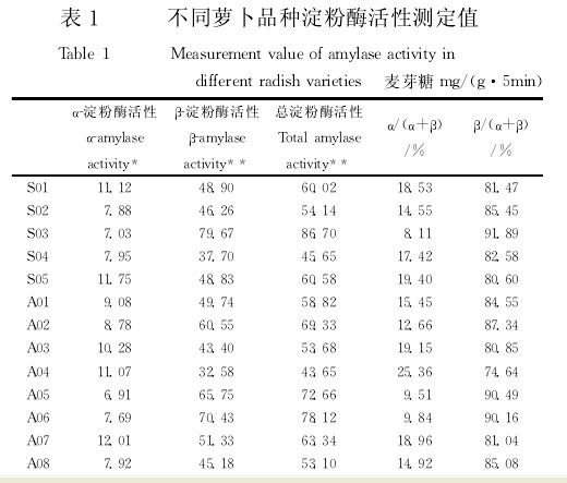 2.2不同蘿卜品種α,β?淀粉酶活性及總酶活性的比較由表1可知,不同蘿卜品種和組合的α?淀粉酶活性、β?淀粉酶活性和總淀粉酶活性均達到了顯著或極顯著的水平。25個品系及組合中總淀粉酶活性的變異范圍為麥芽糖43.65~86.70mg/(g·5min),β?淀粉酶活性的變異范圍為麥芽糖32.58~79.67mg/(g·5min)。品種S03的總淀粉酶活性和β?淀粉酶活性均最高分別為麥芽糖86.70和79.67mg/(g·5min),其后品種依次為A12、A17、A06和A19,而品種A04總淀粉酶活性和β?淀粉酶活性均最低。