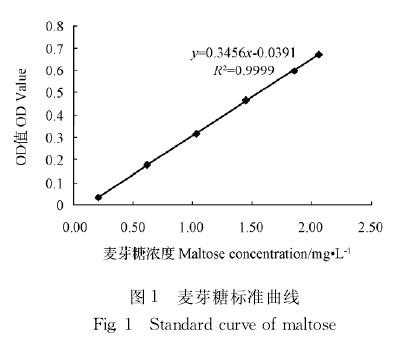 2.1麥芽糖標準曲線根據(jù)測定結(jié)果,采用Excel進行擬合,得擬合方程: Y=0.3456x-0.0391.