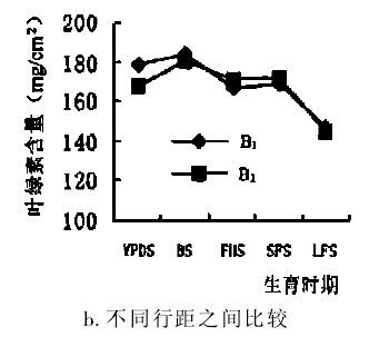 進一步對各生育時期葉片葉綠素含量進行方差分析的結(jié)果表明(表1),各個生育時期影響葉片葉綠素含量的主要因素不同。在幼穗分化期,主要受插秧量的影響,不同插秧量之間葉綠素含量差異極顯著,即插單苗的葉綠素含量極顯著地高于插三苗的。而行距和品種對葉綠素含量的影響反而不明顯。到齊穗期,不同插秧量對葉綠素含量的影響依然存在,但葉綠素含量已經(jīng)開始主要受品種決定,開始表現(xiàn)出品種本身的特性:遼優(yōu)3225的葉綠素含量高于遼粳326,又極顯著高于屜優(yōu)418。而到了灌漿盛期,葉綠素含量幾乎完全由品種決定,品種本身的特性充分體現(xiàn)出來,此時3個品種的葉綠素含量差異更大,遼優(yōu)3225極顯著高于遼粳326,而遼粳326又極顯著高于屜優(yōu)418。灌漿后期由于葉片逐漸衰老,各種因素的作用已經(jīng)不是很明顯。這說明水稻葉片葉綠素含量前期主要受栽培環(huán)境條件制約,而后期主要由品種自身特性所決定。