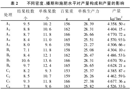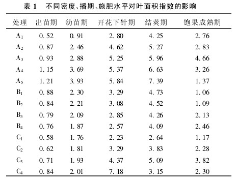 密度為21.0萬株/hm2時,結(jié)莢期的葉面積指數(shù)達7.39,然后到飽果成熟期迅速下降,這是由于密度過大,遮蔭嚴(yán)重,導(dǎo)致下部葉片過早衰落的結(jié)果;而密度為16.5萬株/hm2時,葉面積指數(shù)最高為4.25,未能充分利用光能,群體產(chǎn)量低;當(dāng)密度為19.5萬株/hm2時,最高葉面積指數(shù)為5.96,且能保持較長時間,能充分利用光能,通風(fēng)透光良好,因而產(chǎn)量最高。