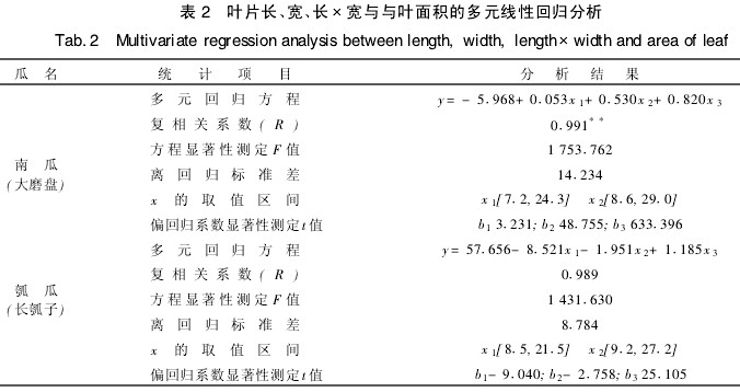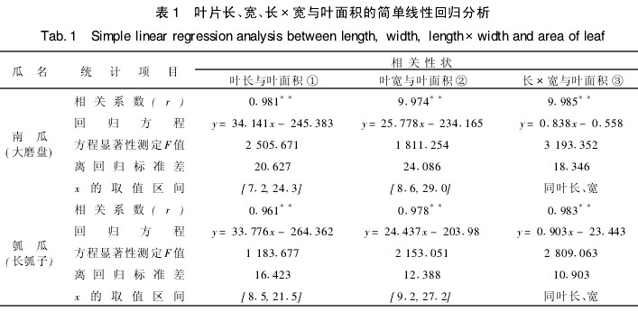 對兩作物各任意選取20株為采葉株,于結(jié)果盛期在每植株上采不同葉齡、不同大小且有形狀代表性的4~6片葉,即南瓜和瓠瓜各100片葉。再用直尺測每片葉子的長(中脈長)和寬(最大寬度),用浙江托普儀器生產(chǎn)的激光葉面積儀測定每片葉子的面積(過大的葉片分幾部分測后相加即得該片葉面積),以此作為真實面積。然后對葉長、葉寬、葉長@寬與葉面積進行簡單線性回歸分析和多元線回歸分析,得出葉面積的測算公式。