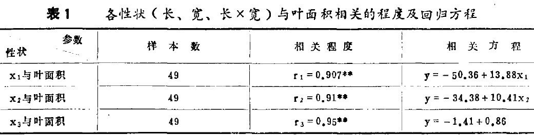 試驗于1985年在新疆八一農(nóng)學院試驗田中進行,供試品種為外銷主栽品種炮臺紅。在哈密瓜生長中期,隨機地在大田中選49片完整、有代表性的葉子編號,然后按順序用透明塑料薄膜描出其面積的大小,而后以此用輪式求積儀求其而積,以及長寬的值,分別以此數(shù)據(jù)為基礎(chǔ)。即長、寬同實際葉而積進行相關(guān)系數(shù)法及線性回歸的擬配,通過電子計算機來求出其擬配方程岌相關(guān)條數(shù)。