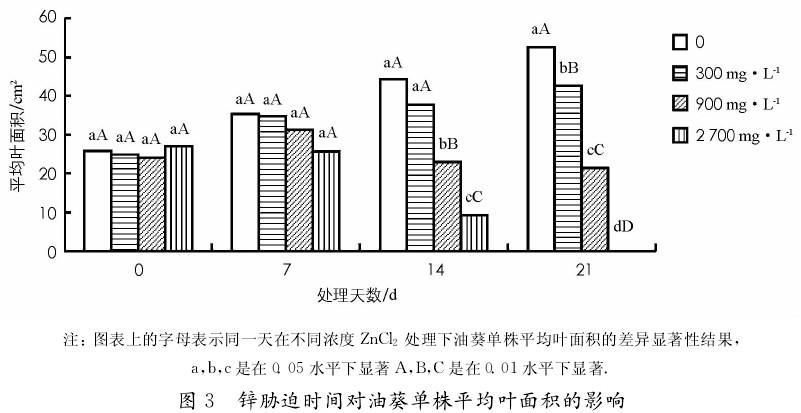 2.3鋅脅迫時(shí)間對(duì)油葵單株平均葉面積的影響
