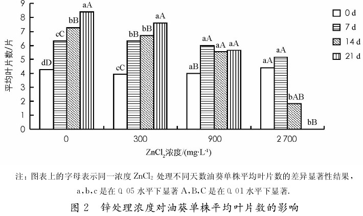 由圖2可以看出,對(duì)照油葵植株的單株平均葉片數(shù)隨處理時(shí)間的延長(zhǎng)顯著增加,21天時(shí)葉數(shù)最多.在300mg/L濃度的ZnCl2處理下,前7天葉片數(shù)顯著增長(zhǎng),但到第14天葉片數(shù)無顯著變化,第21天又明顯增加.說明300mg/L濃度的ZnCl2沒有影響油葵幼苗的生長(zhǎng),但在900mg/L ZnCl2處理下,除葉片數(shù)在第1周內(nèi)顯著增加外,14d以后葉片數(shù)不再增加(差異不顯著).說明900mg/L濃度的ZnCl2顯著影響了油葵幼苗葉片數(shù)量的增加.因此,900mg/L濃度的ZnCl2應(yīng)為影響油葵葉片數(shù)量的臨界值.在2 700mg/LZnCl2處理下,第1周葉片數(shù)無顯著變化,但從第14天開始葉片數(shù)顯著降低,降低了64.60%;21d時(shí),葉片全部脫落.由此可見,在相同時(shí)間內(nèi),ZnCl2處理濃度越高,油葵植株葉生長(zhǎng)影響越大,從輕度受害(葉數(shù)量不再增加、生長(zhǎng)停止)到重度受害(葉片數(shù)明顯減少),直至葉片全部脫落、植株死亡(在2 700mg/L處理下).