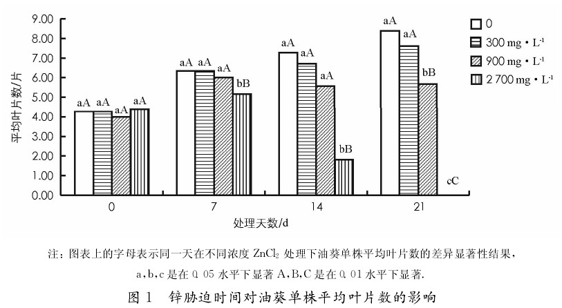 由圖3可以看出,ZnCl2處理前7天油葵單株平均葉面積無顯著變化,處理14d以后,隨著處理濃度的增大葉面積逐漸減小.處理第14天時(shí),0,300mg/L之間差異不顯著,900,2 700mg/L顯著降低,分別降低了48.18%,78.87%.處理第21天時(shí),各處理濃度的差異都達(dá)到了極顯著水平,且2 700mg/L處理下葉片面積降為0.由此可見,由此可見,ZnCl2處理時(shí)間對(duì)油葵幼苗平均單株葉面積有顯著影響,且在一定濃度下,隨著ZnCl2處理時(shí)間的延長(zhǎng),葉面積下降越多.注:圖表上的字母表示同一天在不同濃度ZnCl2處理下.