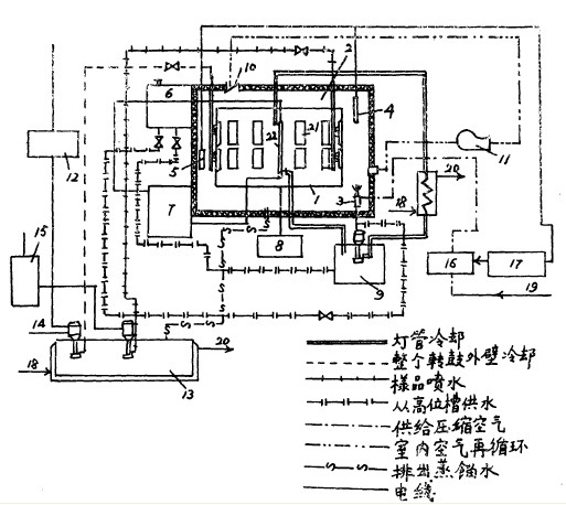 植物生長(zhǎng)室由其中間吊著氨燈22的工作室2組成。裝有樣品21的轉(zhuǎn)鼓1以每分鐘一轉(zhuǎn)的速度轉(zhuǎn)動(dòng)。室內(nèi)裝有:對(duì)樣品噴水的噴嘴,空氣增濕風(fēng)動(dòng)噴霧器3,換氣系統(tǒng)的迸氣訂和排氣管,轉(zhuǎn)鼓噴水裝置,相對(duì)濕度傳感器5和溫度傳感器4?刂坪蜋z側(cè)儀友都移置在植物生長(zhǎng)室正而的控制面板上。植物生長(zhǎng)室的示意圖表示一系列保證規(guī)定工作參數(shù)的獨(dú)立系統(tǒng)。