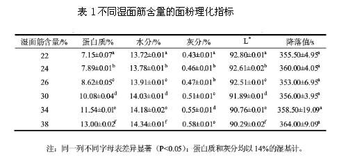 根據(jù)國標(biāo)GB8607-1988和GB8608-1988規(guī)定,面粉濕面筋含量低于24%為低筋面粉,高于30%為高筋面粉,濕面筋的含量可用單頭面筋測定儀進(jìn)行測量。不同濕面筋含量面粉理化指標(biāo)分析見表1。