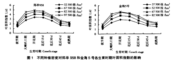 經(jīng)過葉面積測量儀的檢測,并結(jié)合表1我們可以得知,鄭單958和金海5號隨著種植密度的增加,兩個品種在同一生育時期單株葉面積減少,在拔節(jié)期、大喇叭口期、花后45天、成熟期各密度處理單株葉面積差異不明顯,在開花期、花后15天,花后30天各密度處理單株葉面積差異較大。