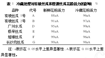 通過種子低溫低濕儲藏柜的研究,并結(jié)合表1,我們可以從中得知,冷藏處理沒有降低普通絲瓜花粉的活力,而有棱絲瓜花粉的活力略有上升,有棱絲瓜品種間、普通絲瓜品種間以及有棱絲瓜和葡萄絲瓜品種間新鮮花粉和冷藏花粉的活力差異均不顯著。冷藏處理有棱絲瓜花粉的活力略有上升,可能與采花朵的時間有關(guān),普通絲瓜是花開1h后采取的,而有棱絲瓜的新鮮花粉是花開后立即采取的,這就說明絲瓜雄花開放后一段時間花粉活力才達(dá)到最高峰。